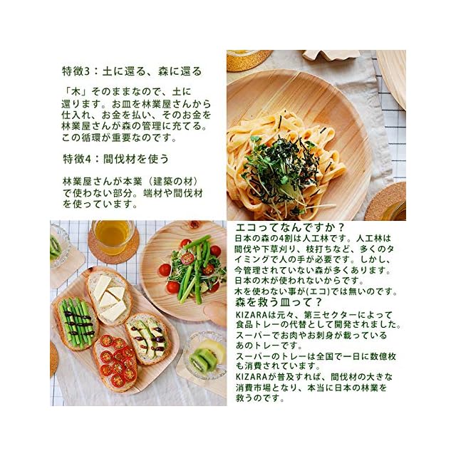 「KIZARA」は環境にやさしい<b>木製の使い捨て皿</b>です。<br> 原料は杉の間伐材でできています。<br> <br> 薄くはいで3枚合わせにした「KIZARA」は一時の剛性を保ちながら、木のぬくもりがあり、使う際に豊かな気分を味わうことができます。<br> ピクニックやバーベキューなどで、いつも使っていた紙のお皿の代わりにKIZARAを使えば、雰囲気アップ間違いなしです!<br> また、塗装もされてないので、そのまま廃棄しても環境に害を与えません。<br> そして、元々棄てられる材料(間伐材)なので、使うほどに利益が出て森林の保守費用に還元されていくという「エコ」にもつながる。<br> それが「KIZARA」なのです。<br> 商品詳細 サイズ 丸皿 直径:21cm 丸皿の高さ(深さ)約17mm 板厚約1mm 素材 杉(国産) 色 無着色 商品説明 1)使い捨てを前提に作られたお皿です。 2)電子レンジやオーブンでは使えません。 3)長時間水に浸けると、湾曲します。 販売単位 8枚セット