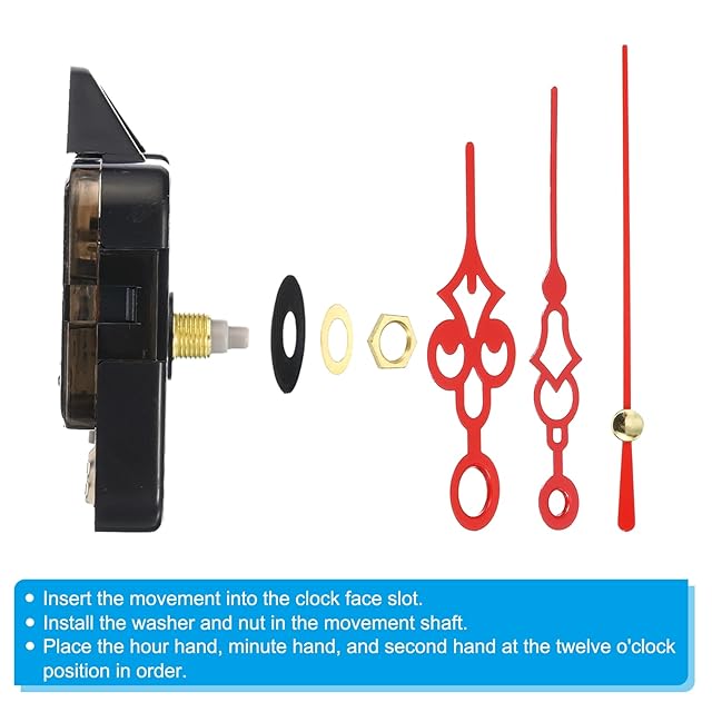取扱説明:1. ムーブメントを時計のフェーススロットに挿入します。2. ムーブメントシャフトにワッシャーとナットを取り付けます。3. 時針、分針、秒針を順番に12時の位置に配置します。