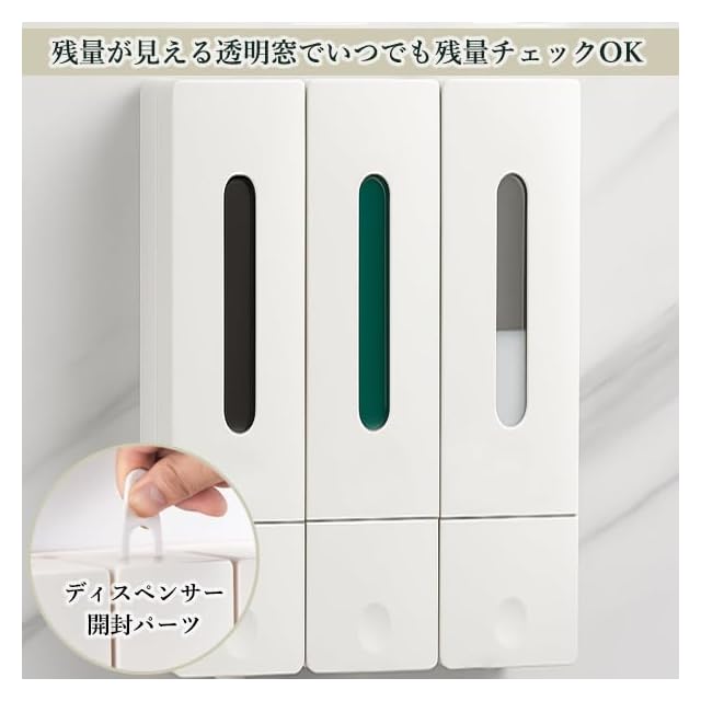 3連ディスペンサー:家族で使える!3種類の液体をすっきり分けて収納。壁掛け簡単設置:粘着シール付きで、工具不要&穴あけ不要。