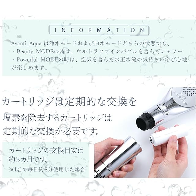 交換目安は3カ月です。 (1人が毎日約8分間/毎分8ℓ使用した場合) ※塩素除去率は使用開始時99%以上で、使用しているうちに徐々に低下していきます。一般社団法人 浄水器協会では50%以上塩素を除去できるシャワーヘッドを浄水シャワーと呼んでいるため、 交換時期は除去率が50%以下になる前に設定しています。