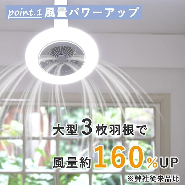 【天井の空気を循環させるファン】ライトの中心にファンを搭載しているので、お部屋の上部に溜まった空気を循環させ、心地よい風を送ります。大型3枚羽根によって従来品より風量が約160%UPしました。脱衣所やキッチンでの換気にも最適です。風量は5段階で調整でき、ファンとライトは単独での運転が可能です。