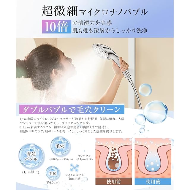 【2025年業界初・超微細バブル技術】 2025年に登場した業界初の超微細泡技術を搭載した シャワーヘッド は、マイクロナノバブルを活用して、毛穴の奥まで届く微細な泡で、通常のシャワーでは落としきれない汚れや皮脂をしっかりと洗浄します。これにより、肌に優しい水流で、乾燥肌や敏感肌の方にも安心して使用できます。さらに、微細なバブルが肌をしっとり保ち、洗浄後の肌を潤いのある状態に保ちます。これまでのシャワーとは違い、シャワータイムがリラクゼーション効果をもたらし、まるで高級スパのような心地よい体験を提供します。肌に優しいだけでなく、環境にも配慮されたデザインで、シャワー後の肌の感触に驚きの違いを実感できること間違いなしです。