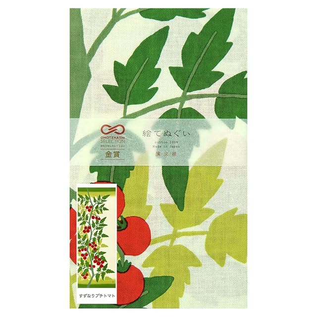 【すずなりプチトマト】<br> 今年の夏も、畑にプチトマトがたくさん。<br> 爽やかな緑の葉に連なる赤い実が元気をくれる1柄です。<br> <br> 【絵てぬぐい】<br> 1枚の絵としてお飾りいただける「絵てぬぐい」は、<br> てぬぐいとしてはもちろん、季節感あふれるインテリアとしても好評です。<br> 横浜の粋と遊び心を持つ濱文様らしさに溢れた「絵てぬぐい」を是非お楽しみください。<br> <br> ◆素材:綿100% (厳選した木綿生地を採用しています)<br> ◆サイズ:約34cm×90cm (布の伸縮により多少の誤差があります)<br> <br> 【製品仕様】<br> ・横浜伝統の型染め手法である ”捺染 (なっせん)” でお作りしています。<br> ・柄のプリントは片面 (表) のみとなっております。<br> ・端を縫わない ”切りっぱなし” 仕様の、昔ながらのてぬぐいです。<br> ・ほつれは自然と止まりますので、適宜ハサミでカットしながらお使いください。<br> <br> 【注意事項】<br> ・色合いはご覧頂く環境によって印象が異なる場合があります。<br> ・濃色は色落ちする場合がありますので、単独での手洗いを推奨しております。<br> ・塩素系漂白剤はご使用にならないようお願いします。<br> ・濡れたまま重ね合わせたりすると色が滲む場合がありますのでご注意ください。<br> ・素材の特性上、洗濯をすると多少縮みます。<br> ・額装する場合は水通しせず、アイロンと霧吹きでシワを伸ばしてお飾りください。<br> <br> 【ブランド】<br> 横浜のテキスタイルブランド「濱文様」(はまもんよう) は、<br> 横浜伝統の型染め手法である ”捺染 (なっせん)” で染め上げた色あざやかな「てぬぐい」や<br> 風呂敷・タオル・ハンカチなどを中心に、数多くの和雑貨を企画・製造・販売しています。<br> <br> 遊び心のある個性的なデザインが特徴で、<br> 四季折々の風情を感じさせるオリジナルデザインを発信し続けています。<br>