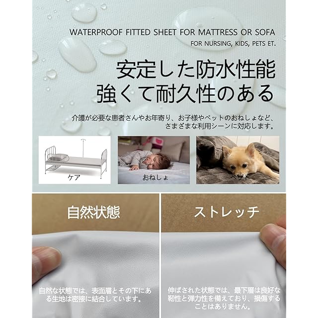 【5面防水】製品の前面と側面には防水TPU膜があり、マットレスや保護が必要な製品を完全に包み込むことができます。介護が必要な方、お子様、ペットのいるご家庭に最適です。