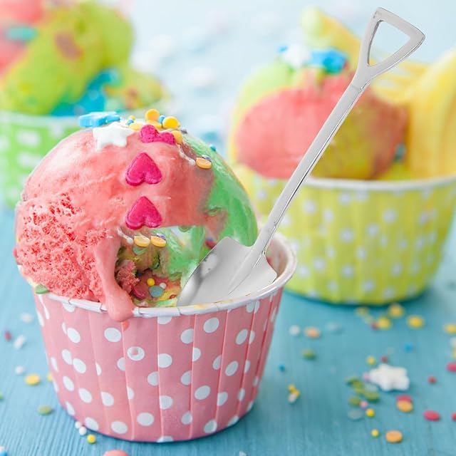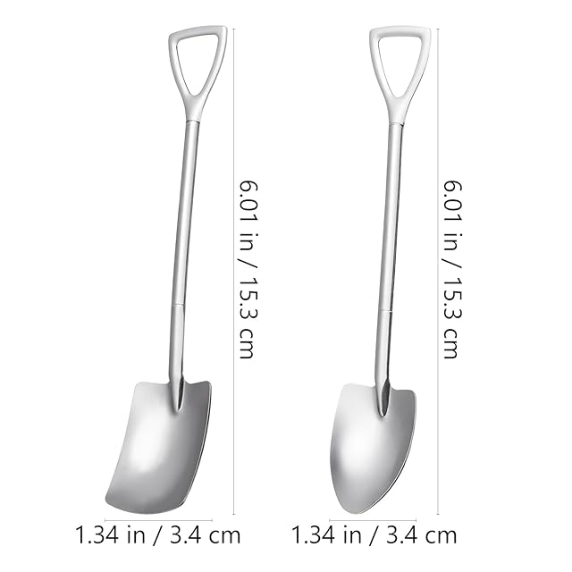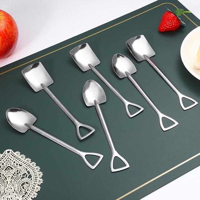【かわいいシャベル形状】ステンレススプーン X 6本。2つの創造的な形:かわいい正方形のシャベル、オプションのとがったシャベルの形。これらの金属スプーンは、ティースプーンやデザートスプーンとしての使用に非常に適しています。
