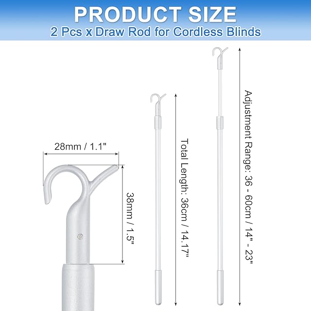 [サイズ&パッケージング]: 引き棒の長さは36 cm / 14.17"、調整範囲は36 - 60 cm / 14 - 23"、フックサイズは38 x 28 mm / 1.5 x 1.1"(長さ x 幅)、パッケージにはコードレスブ ラインド用引き棒2個が含まれています