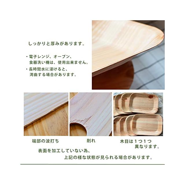 木の薄い板を3枚、木目を交差する様に貼り合わせ、プレスしたお皿です。 薄くて軽いので、バーベキューやアウトドアに持っていってください。 特徴1:木の香り 表面加工を一切行っていない無垢のお皿のため、木の香りがします。 特徴2:軽くてそれなりに丈夫 木には目という割れたり、裂けたりする方向が決まっています。 その木の目を交差させる事で、食べ物を載せても割れたりしないように丈夫に出来ています。 特徴3:土に還る、森に還る 「木」そのままなので、土に還ります。木材を林業屋さんから仕入れ、お金を払い、 そのお金を林業屋さんが森の管理に充てる。この循環が重要です。 特徴4:間伐材を使う 林業屋さんが本業(建築の材)で使わない部分。端材や間伐材を使っています。 商品詳細 素材 杉(国産) 色 無着色 商品説明 1)使い捨てを前提に作られたお皿です。 2)電子レンジやオーブンでは使えません。 3)長時間水に浸けると、湾曲します。 販売単位 8枚セット サイズ 角皿 縦16.5×横23.5cm 角皿の高さ(深さ)約20mm 板厚約1mm