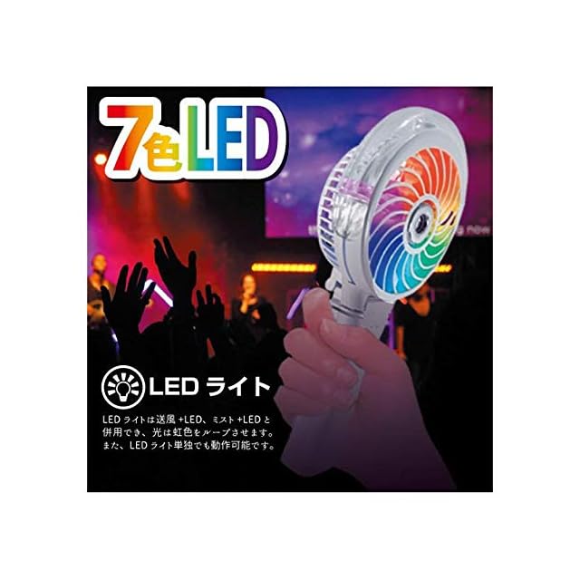 リチウムイオン電池搭載のLEDファンです。 風量3段階調節に加え、ミスト機能で冷風扇効果も得られます。 風の直進性を高める専用の7枚羽根を使用し、ミストを遠くまで、真っ直ぐに届けます。 ハンドル部分をを折りたたむ事により、卓上扇風機としてご利用いただけます。 卓上扇風機モードでも送風・LED発光・ミスト噴霧も使用可能です。