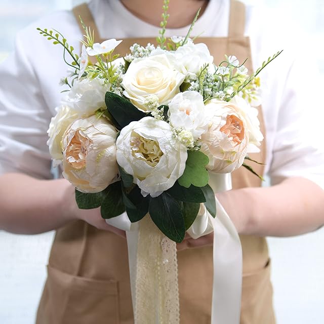 misaki ウエディングブーケ ブートニア 花嫁ブーケ 牡丹 バラ ガーデンローズ ブライダルブーケ ラウンドブーケ 花束 造花 欧米風 挙式 結婚式 パーティー ニ次会 撮影 (ホワイト&ライトピンク)