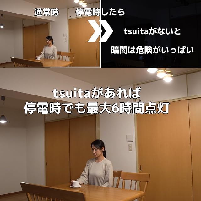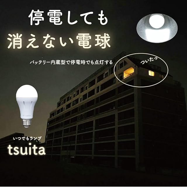 このお礼品は、沖縄県へはお届けすることができません。あらかじめご了承ください。<br> 地震で揺れている時に停電すると怖いですよね?停電しても消えない電球「いつでもランプ tsuita」があれば、もう、停電ニ真っ暗ではなくなります。<br>「いつでもランプ tsuita」は普段使いの延長線上にある防災グッズとして注目度急上昇中のLED電球です!停電してもなんと6時間点灯し続けます!<br>もはや停電していることに気づかない、そんなお声もいただいています。<br>地震や災害時などに発生する万が一の停電の際にも、日常生活を過ごしている空間でいつも通りの明かりを確保することができるので安心感が変わります。<br><br>(抜群の省エネ性)<br>消費電力も 6W と省エネ性も申し分なし。<br>リビングなどでよく見る丸形の蛍光灯をご使用の方はLED照明へ取り換えるだけで省エネ性も高く、毎日使うものなので節電・節約にもなります。<br>リビングはもちろん、廊下や玄関、洗面所、トイレ等の電球も、交換するなら省エネ+防災の「いつでもランプ tsuita」へのお取り替えをおすすめします。<br>普段使いの延長線上にある防災のため、万が一の停電時に懐中電灯を探すことが必要なくなり、電池の交換や充電のし忘れといった問題も発生しません。<br>避難時や物を探す際には、付属品を取り付けていただけますと懐中電灯の代わりにもなるのも便利機能の一つです。<br><br>(日本製だから安心)<br>商品の開発と製造・提供を東京都稲城市で行っております。<br>●定格電圧 100V(日本国内仕様)<br>●スイッチ付きフックの付属品は電球とセットで同梱しております。<br><br>(仕様)<br>明るさ:50W相当(660lm) 寸法:60×117mm 停電時点灯:6時間(200lm)<br>タイプ:LED電球 バッテリー容量:2,600mAh LED寿命:40,000時間<br>口金:E26<br><br>色:電球色(2,700K)<br><br>■お礼品の内容について<br>・いつでもランプtsuita[1個]<br> 製造地:東京都稲城市<br> 使用期限:LED寿命:40,000時間<br><br><br>■原材料・成分<br>PC、PA、LED、リチウムイオン電池<br><br>■注意事項/その他<br>※お取付け可能な照明器具は金口 E26 です。<br>※照明器具がセンサー式や調光式の場合、ご使用いただけません。<br>※一つのスイッチで照明と換気扇等の電気製品が同時に作動する環境下ではご使用いただけません。<br>※画像はイメージです。