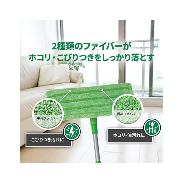 2種類のファイバーでホコリもこびりつき汚れも落とします。 ハンドルは伸縮式で、使いやすい長さに調整できます。