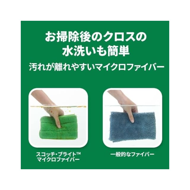 マイクロファイバーを使用した専用クロス。2種類のファイバーがホコリやこびりつき汚れを落とします。折り返しクロスヘッド付きタイプで立ててゴシゴシ拭くこともできます。カラ拭き・水拭き両用に対応。