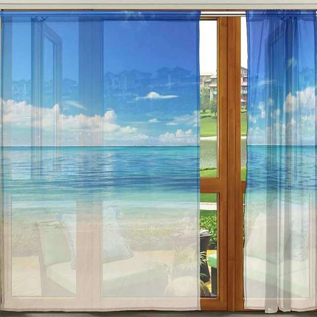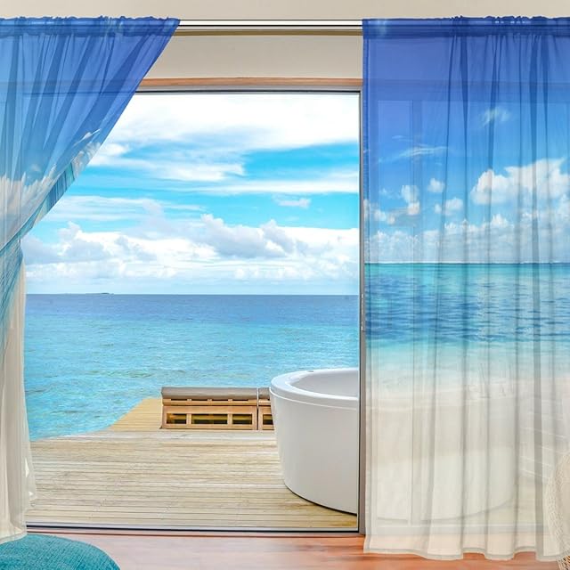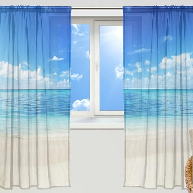 マキク(MAKIKU) ミラーレースカーテン 遮光 断熱 遮熱 レースカーテン 出窓 ドアカーテン おしゃれ ハワイ 北欧 砂浜 海 ブルー シェードカーテン UVカット 薄い 目隠し 幅140cm×丈200cm 2枚組