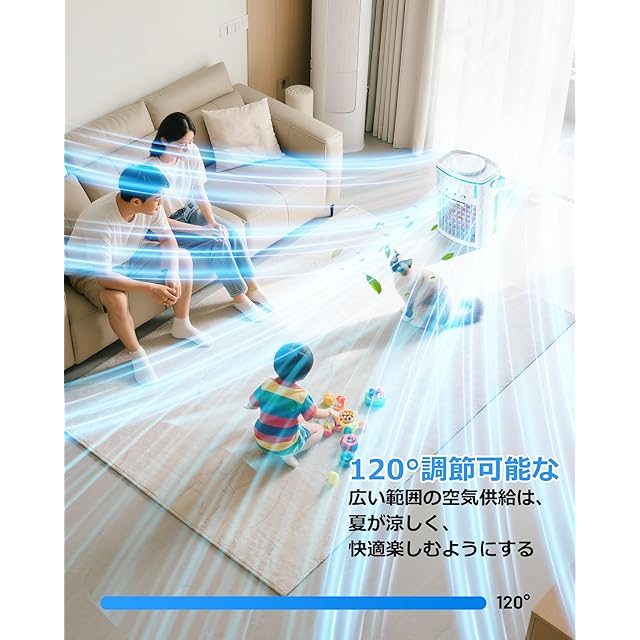 「3段階風量調整&家族に優しい」冷風機は強・中・弱の3段階で風量を調節可能。暑さの程度に合わせて微風から強風までお選びいただけます。冷風機は扇風機より涼しく、エアコンより省エネ!広範囲に涼風をお届けするため、上下120°の手動ルーバー調節が可能です。これにより冷気が部屋中に行き渡り、快適な室内環境でお過ごしいただけます。