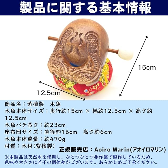 商品名:【自宅で法要する方に最適】 木魚 木製 バチと座布団セット 高級紫檀製×高耐久 5寸(横幅12.5cm) Aoiro Marin