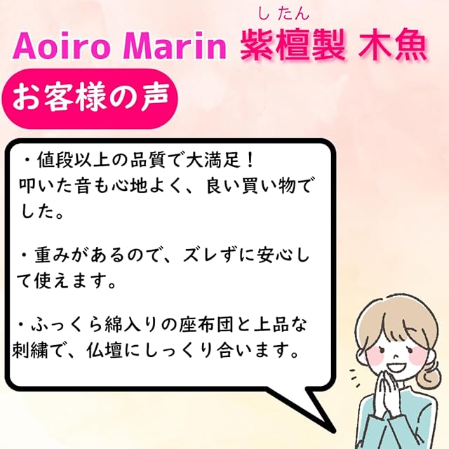 【自宅で法要する方に最適】 木魚 木製 バチと座布団セット 高級紫檀製×高耐久 5寸(横幅12.5cm) Aoiro Marin