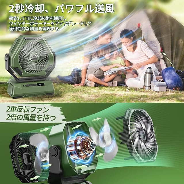 商品名:Noiclub キャンプ扇風機 充電式 【多機能ファン&20000mAh充電池内蔵】 アウトドア扇風機 自動首振り 60時間連続使用 風量3段階調節 強力 吊り下げ 小型 LEDライト搭載 二重反転ファン サーキュレーター 卓上扇風機 防災 業務用 工業扇 車中泊 コンパクト 持ち運び便利 熱中症対策 日本語説明書付き