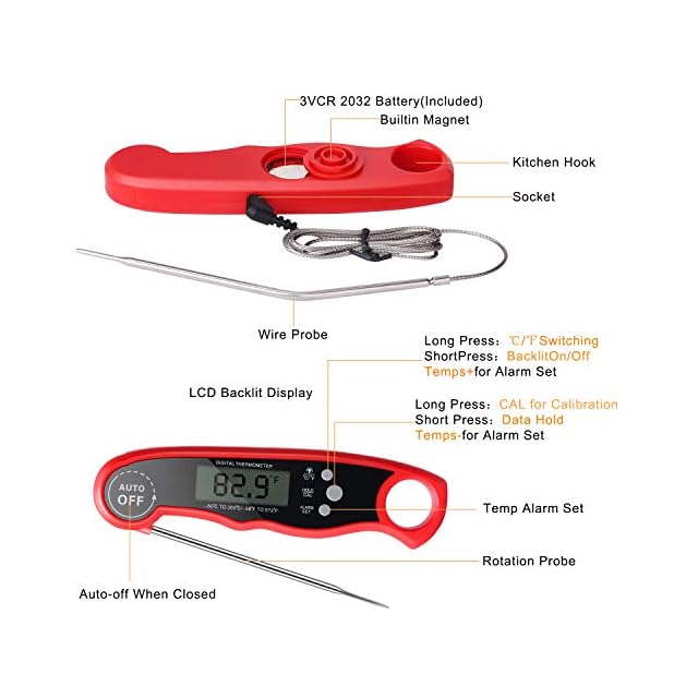 【食品安全&収納に便利】食品レベルの304ステンレス鋼で作られ、無毒、安全安心です。壁掛け用フック穴付き、どこでも簡単に掛けられ、スペースを節約できます。折り畳み式プローブを備えた料理用温度計は背面に強力なマグネットがあるから、冷蔵庫のドア、バーベキューラック、またはその他の金属面に温度計を取り付けることができます。