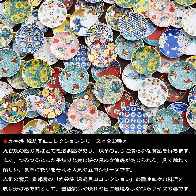 ■商品詳細<BR> インスタ映え!人気の窯元 青郊窯の「吉祥 縁起豆皿コレクション(単品)」です。お醤油皿や料理を取り分けるお皿として、普段使いに最適な手のひらサイズの器です。 縁起豆皿シリーズは全部で33種類、食卓を華やかにしてくれる おしゃれ な和食器です!<BR><BR> 商品SPEC<BR> ■size:径9.5cm×高さ1.8cm<BR> ■専用 化粧箱入り<BR> ■生産国:日本製<BR> ■素材:磁器<BR> ■電子レンジ:使用可<BR> ■食洗器:使用不可(繰り返し食洗器で洗いますと色落ちします)<BR> ※直火、オーブンでのご使用はお控えください。<BR><BR> ≪九谷焼≫ 加賀百万石の伝統美<BR> 加賀百万石に代表されるその豪放、華麗な風格を持つ作風は他の焼き物の追従を許さないものがあります。開窯以来360年の歳月を経た現在も尚、その技は脈々と受継がれ世界的に高く評価されております。
