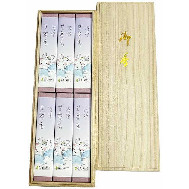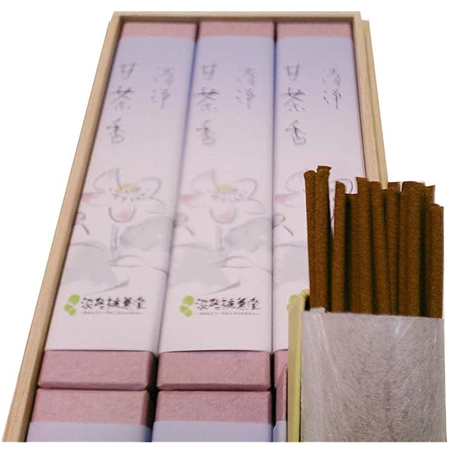 喪中見舞いご贈答用お線香。デパート(百貨店)ご好評お供え物。お線香ギフト桐箱・御線香贈答用セット|「仏様のご馳走願いを叶う」といわれる神仏お好み、爽やかな、穏やかな甘味のある香りの良いお線香ギフト・立ちあがり歩むお線香贈答用希少なこだわり甘茶のお香、清浄甘茶香。淡路梅薫堂 仏様のご馳走甘茶香 清浄甘茶香 6箱入 桐箱 #81。立ち上がる為のお清めに良い甘茶は開運・厄除けの神仏に喜ばれるお線香です。 お賽銭を入れてからお願いするように、神仏お好み甘茶のお香をお供え差し上げてからお願いをする。お線香お供え物で仏様にお願いして良いのは名物・好物甘茶香。仏様のご馳走願いを叶う。ご進物用・ご贈答用・お供え用お線香にも好まれ喜ばれる甘茶のお線香です。 お盆のメインはお線香です。お客様が来てお出しするお盆に乗るお茶・お菓子。49日から仏様として旅する先祖様がお客様として戻られるお盆のご仏前に乗せる、いつもより一層神仏お好み想い馳せ、お心遣いでご配慮した仏様のお食事お線香、神仏お好み仏様のご馳走甘茶香。 仏様のお食事を照らす蝋燭、色どりになる花、落ち着いて過ごしてもらうお経。仏様に喜ばれるお盆の主役はお線香です。 盛大におもてなしする新盆・初盆には、仏様のご馳走甘茶香を差し上げご供養しましょう。創業から百年以上の歴史を誇る淡路梅薫堂製造。長年の伝統製法を大切に、天然原料にこだわりお線香を作り続けております。人の集まる銀座や京都は市場のようなお線香の販売地。 日本一のお線香生産地は淡路島西海岸にあります。中でも全国唯一といえる線香屋が軒を連ねるかおり風景100選の一つ江井。良いお線香を作るのに相応しい、偏西風を利用する西側を向いた県道31号線のお線香に好まれる一番といえる良い場所で丁寧に製造してお届けします。ご進物用お線香・お線香ギフト・贈答用お線香は、大切な方へ想いを形に淡路梅薫堂のこだわりお線香の香りに託してどうぞ。