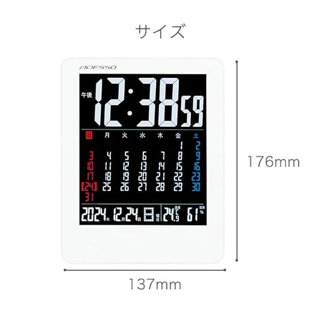 ADESSO(アデッソ) 置き時計 電波 デジタル カラーカレンダー 電波時計 温度 湿度 曜日 日付表示 置き掛け兼用 ホワイト NA-945