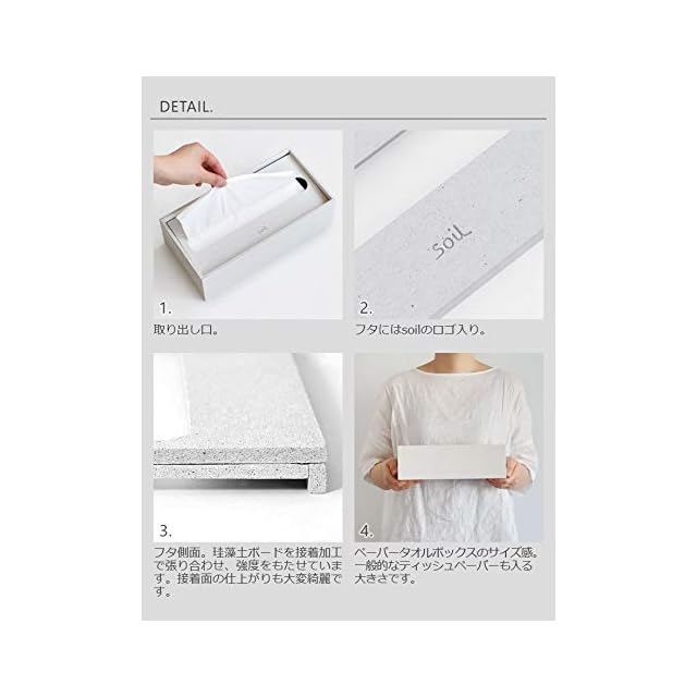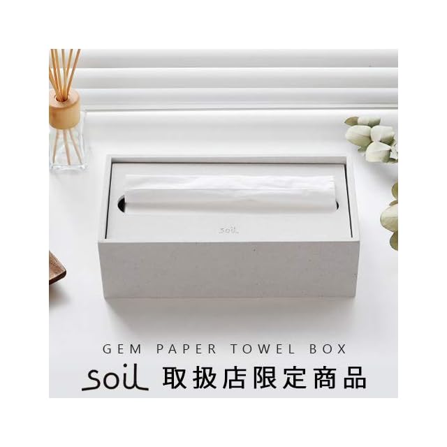 速吸水・速乾! 自然素材「珪藻土」キッチン・洗面所でも快適に使えるペーパータオルケース。吸水性の高さを誇る注目素材「珪藻土(けいそうど)」で作られたGEM ペーパータオルケースの登場です。「珪藻土」に新たに「ひる石(鉱物の一種)」が配合された新シリーズ「soil GEM」は、さらに性能がアップ。吸水性、軽さ、丈夫さ、目詰まりのしにくさなど、毎日使うものだからこその良さを感じることができます。また「ひる石」が配合されたことで、石のような見た目で高級感があり、インテリア性も高く生活感を感じないスタイリッシュなデザインです。品質にこだわった自然素材を使用した日本製で安心してご使用いただけます。吸湿性の高さから、キッチンや洗面所など水回りでのご使用に最適です。ペーパーを引き出すときに飛び散りやすい水分をすぐに吸水し、自然に乾燥します。ケース内のペーパーが湿りにくく最後まで快適に使えます。フタは適度な重みがある落とし蓋タイプ。しっかりとペーパーを抑え、ペーパータオルやキッチンペーパーなど厚みのあるペーパーもスムーズに取り出すことができます。一般的なティッシュペーパーのケースとしてもご使用いただけるサイズ感です。ご家庭でのご使用はもちろん、カフェやホテルなど使用頻度の高いサニタリースペースを快適・清潔に飾るアイテムとしてもオススメです。※ペーパータオルは付属しません。