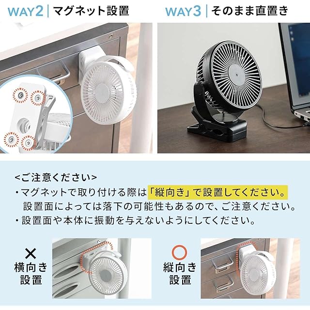 複数の取り付け方法:クリップで直径12cmまでしっかりと固定できます。 卓上、クリップ、壁掛けは3方向のデザインなので、様々なシーンでお使いいただけます。