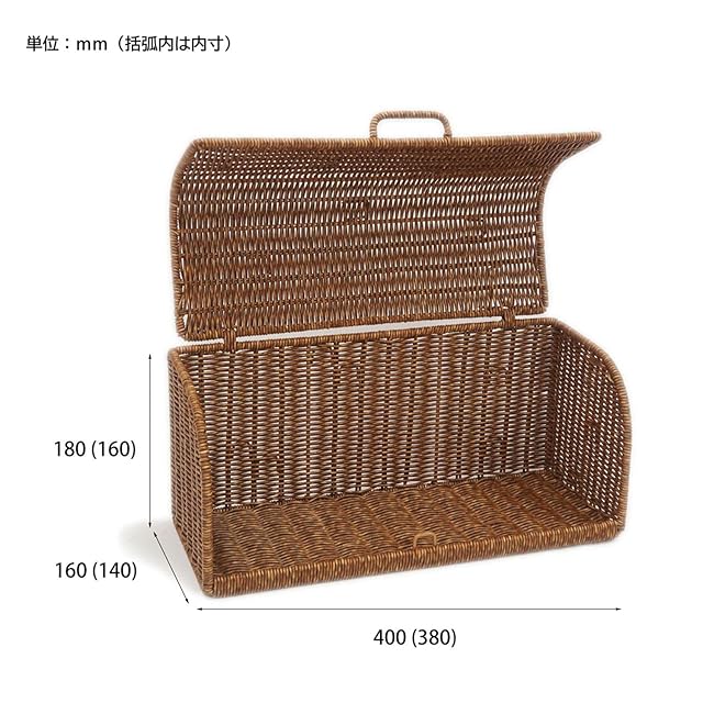 サイズ:約W400×D160×D180mm 材質:ポリプロピレン、ポリエチレン、アイアン 生産国:中国 パンやシリアルがすっきりまとまるブレッドケース。 ロングタイプは、カウンターやレンジボードのデッドスペースを有効に使えるスリムサイズ。 食品の収納以外に、日用品やコスメ類の収納、ゲーム機や充電器のケーブル類など隠したい物の収納にもおすすめです。 水に強いポリプロピレン・ポリエチレンチューブを使って手作業で編まれたバスケットです。 水洗いができるので汚れてしまっても清潔に保てます。 ※濡れたままの状態で長期間放置すると錆の原因となります。洗浄後はよく乾燥させてください。 パンやお菓子の他によく使う食器やマグカップ・コーヒーのセットを入れたり、 カウンターの上に置いてキッチンの目隠しとしても使えそうです。 フタは上に大きく開く構造なので、手前にスペースが無くても中身を取り出せます。 また、何が入っているか一目見て把握できるので整理整頓しやすいのも嬉しいポイントです。 まるで天然素材のようなナチュラルな雰囲気。 その他のユティルシリーズと合わせてご使用いただくと より統一感が出ておすすめです。