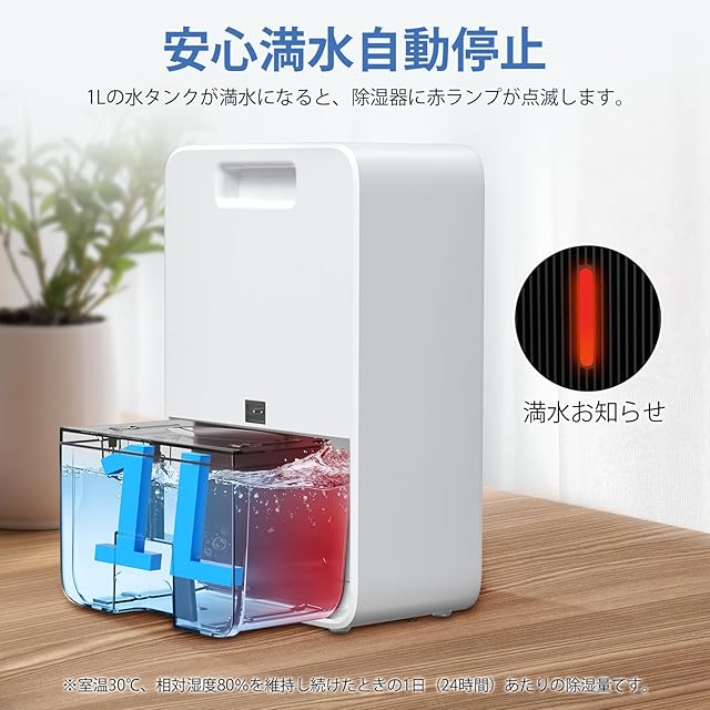 【除湿効果が見えるな透明タンク&満水お知らせ 】 水タンクが満水になると、除湿機に赤信号が点灯します。大容量透明水タンクを搭載します、水が満タンになるとタンクは重くない、取っ手がついているため両手で簡単に排水できる、スムーズに水を流せる。溜まった水を排出してから、再度除湿器の電源を入れてください。