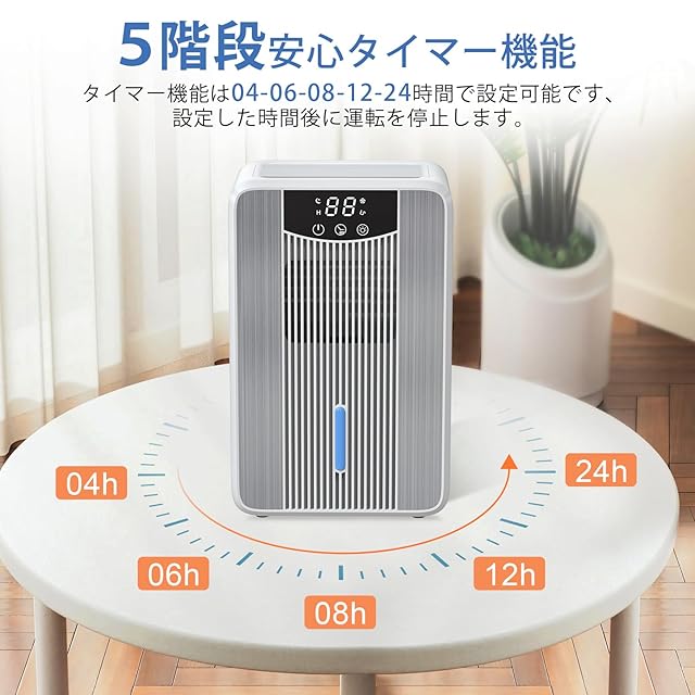 【5階段安心タイマーを付き】タイマーは4・6・8・12・24時間に設定することができます、設定した時間後に運転を停止します、就寝や外出の際にも重宝に使用可能です、無駄な電気代の心配がない。ナイトモードで、除湿機の操作音はわずか40dB、寝室や子供部屋に置いてもほとんど気にすることもなく快適に眠ることができます。デジタル画面が消灯し、就寝時の気になる光を軽減、風量の弱設定を自動で行います。
