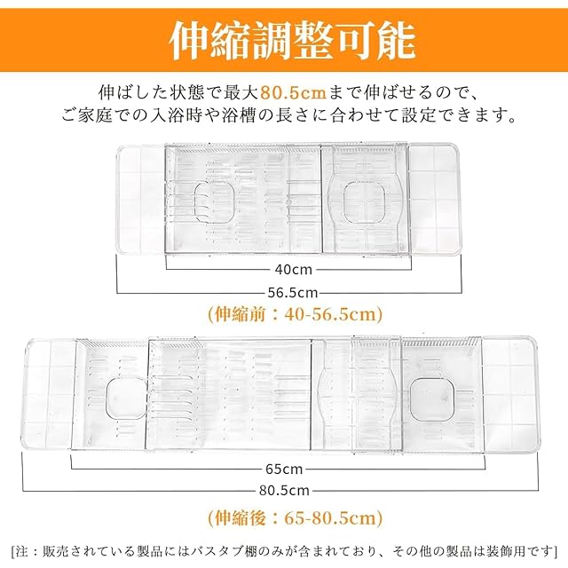 商品名:バスタブトレー クリア お風呂トレー 浴槽テーブル 台 大容量 伸縮サイズ56.5-80.5cm PET バスタブラック 滑り止め 防水 カビない 透明 バスタブブックスタンド 半身浴 読書 浴室/為に/アパー/スパ すべての浴槽 小物置き お風呂用品 お手入れが簡単