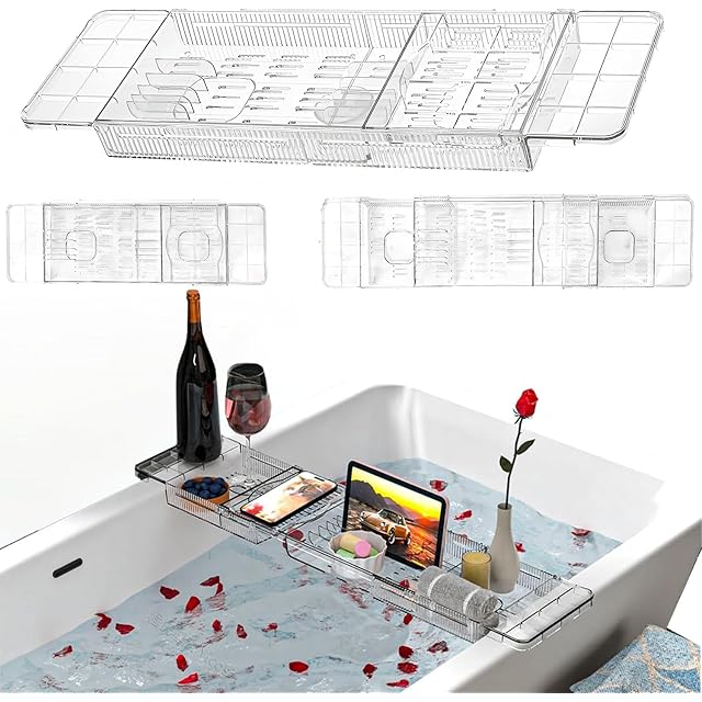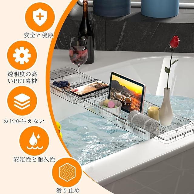 バスタブトレー クリア お風呂トレー 浴槽テーブル 台 大容量 伸縮サイズ56.5-80.5cm PET バスタブラック 滑り止め 防水 カビない 透明 バスタブブックスタンド 半身浴 読書 浴室/為に/アパー/スパ すべての浴槽 小物置き お風呂用品 お手入れが簡単