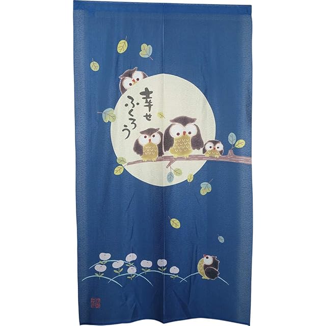 商品名:アーリエ(Arie) のれん 暖簾 間仕切り 目隠し ロングサイズ おしゃれ 洗える 幸せふくろう ブルー 約幅85cm×丈150cm 727223