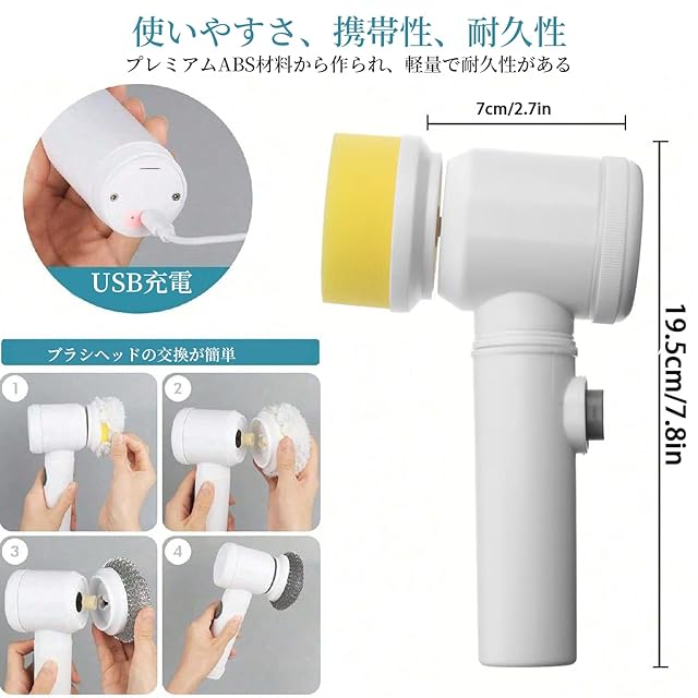 4点セット内容:本体、収納ホルダー、アタッチメント3種(ブラシ、スポンジ、仕上げ用パフ )。さまざまな浴室電動ブラシヘッドを使用して、さまざまな領域や材料をクリーニングできます。サイズ:約20*11cm。