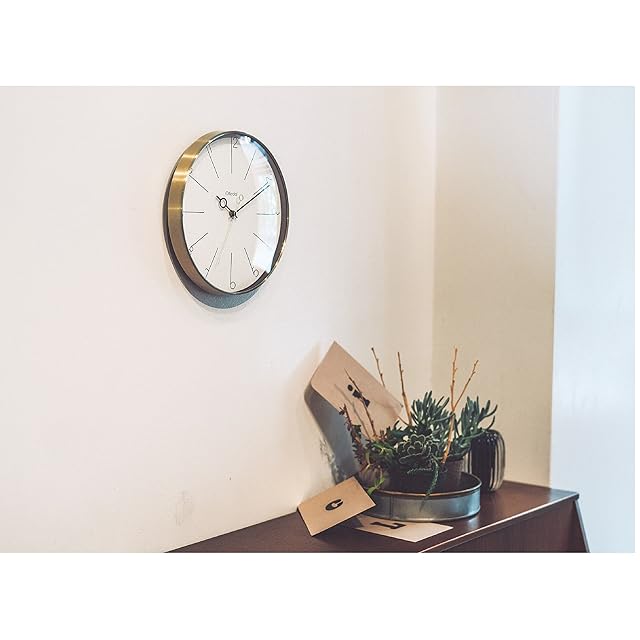 【商品の概要】 細いラインでデザインされた盤面を、深みのあるゴールドのフレームで包み込んだモダンな掛け時計です。中心に向かって真っ直ぐに伸びる細いラインインデックスと、数字とリンクした特徴的なアクセントを持つ短針と秒針がスタイリッシュに融合し、柔らかな曲面を描くガラスカバーがエレガントなイメージに仕上げています。