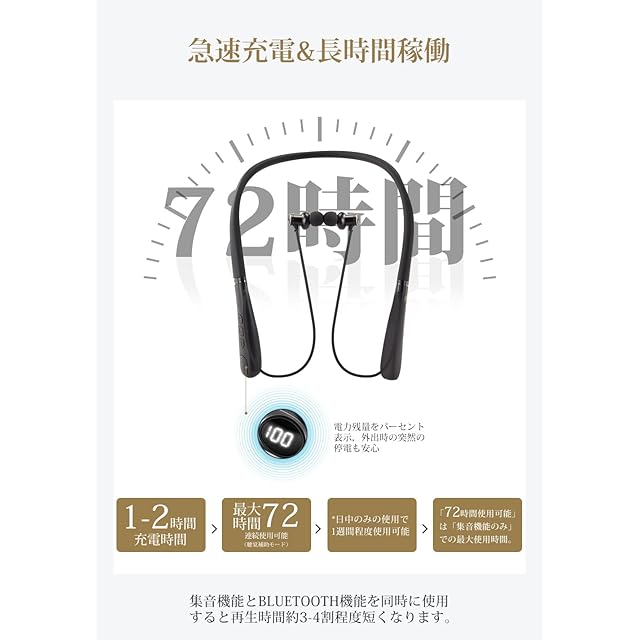 【長時間稼働・電力残量表示】充電式集音器はType-C充電線とLEDスマート電力量ディスプレイがあり、電力残量をリアルタイムでチェックできます。2時間のフル充電で最大72時間の連続使用が可能で、電池交換を繰り返す手間が省け、外出や旅行などでも安心して使用できます。※集音機能とBLUETOOTH機能を同時に使用すると使用時間が短くなります。