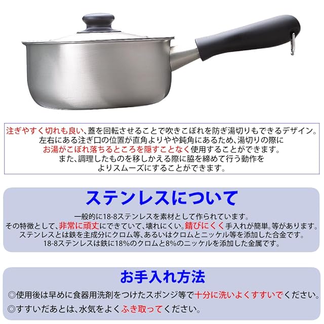 【使いやすさにこだわった片手鍋】右利き・左利きどちらの人にも使いやすい左右の注ぎ口。鍋の縁は丸みをつけて水切れをよくしました。ハンドル(柄)は炎との距離を計算した長さで、しっかりと握りやすく手になじみます。また、ふたを回して隙間を調節することで、ふきこぼれを防いだり、湯切りもできます。