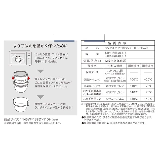 材質:保温ケース/ステンレス鋼(アクリル樹脂塗装)、保湿ケースフタ/PP(中材:発泡PP断熱材)、止め具・リング・おかず容器本体・ご飯容器本体/PP、おかず容器フタ/シリコーンゴム