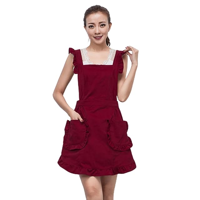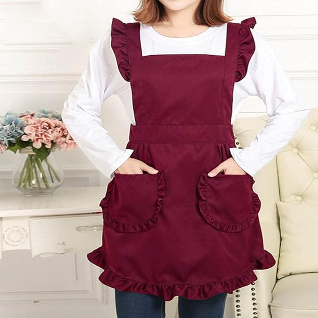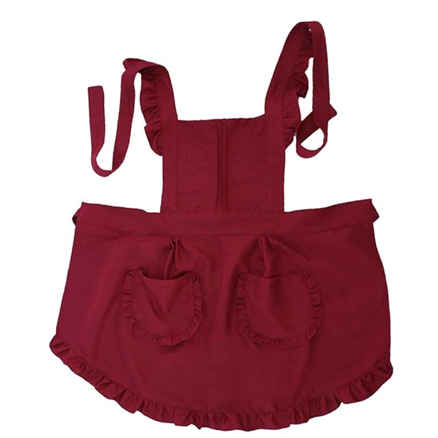 [Kisata] エプロン 女性用 フリル h型 かぶるだけ エプロン レディース メイドコスチューム シンプルエプロン ポケット付き エプロン かわいい カフェエプロン 家庭用 バーガンディ