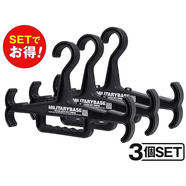 【Φ38mmの太い竿にも対応!重量物も安心して吊り下げ可能なヘビーデューティハンガー】<br><br>MILITARY BASE ヘビーデューティ タクティカル ハンガー EVO 3個セットです。38mmまでの物干し竿に対応します。圧倒的な強度と使い勝手から、自衛隊にも納品された実績をもつタクティカルハンガーの決定版といえる逸品です!<br><br>約68キロとかなりの重量を吊り下げ可能なヘビーデューティなタクティカルハンガーです。サバゲ装備ならラクラクアンパイで吊り下げ可能でしょう。<br>ボーガン様なデザインがイカス(・∀・)タクティカル感満載なハンガー。その強度意外にもベストやチェストリグが吊り下げやすいフックの効いた形状で、よく使う装備をまとめてセットアップして保管が可能になります。<br><br>せっかくハンガーが重くても従来モデルは細い竿にしか対応できませんでしたが、当モデルは38mmの極太竿対応に進化♪お気に入りコーディネートをまるごとセットでストレージ♪たくさん吊り下げても安心で言うことなし!装備コダワリ派には非常に助かるアイテムです。<br><br>■返しの付いたデザインと強度であらゆる用途に使用可能<br>返しの付いた独特のデザインのお陰で、ベストやウェーダーのような形状のアイテムでもずり落ちることなくしっかり吊り下げることができます。強度にも優れた当ハンガーでは、工具や各種ツール類を装備した作業ベストや酸素ボンベなども余裕で吊り下げ可能です。シーンを選ぶことなく活躍してくれます?サバゲだけでなく革ツナギやダイビングギア、フィッシングギアの保管にどうぞ!<br><br>