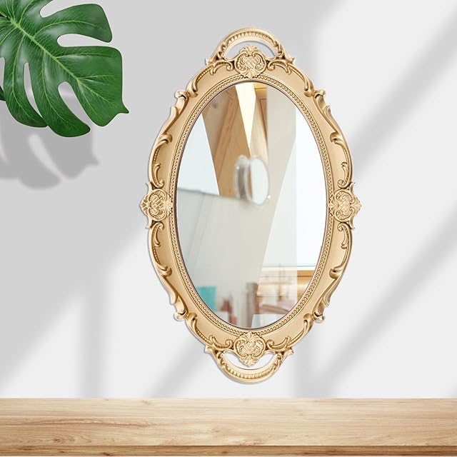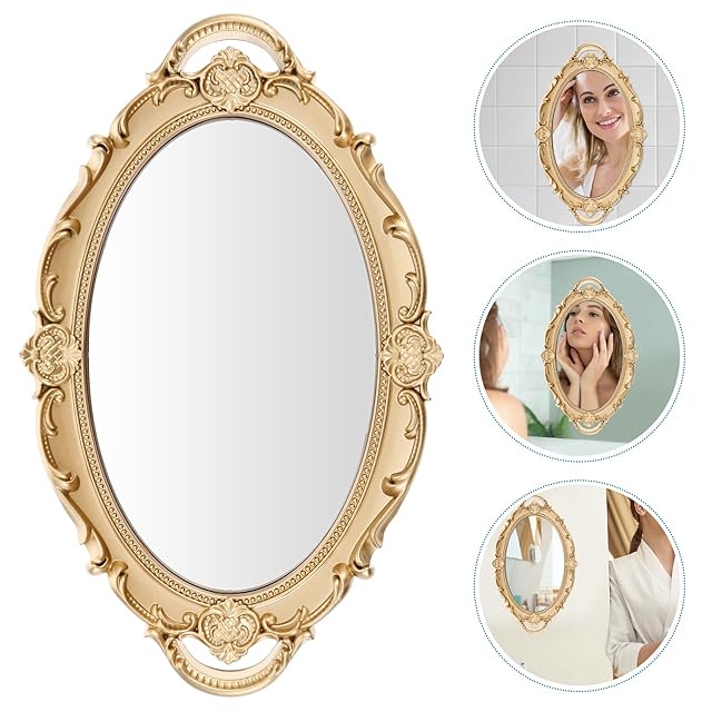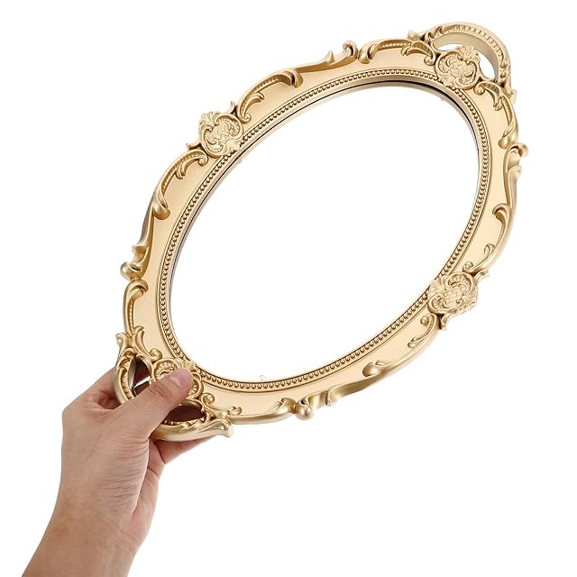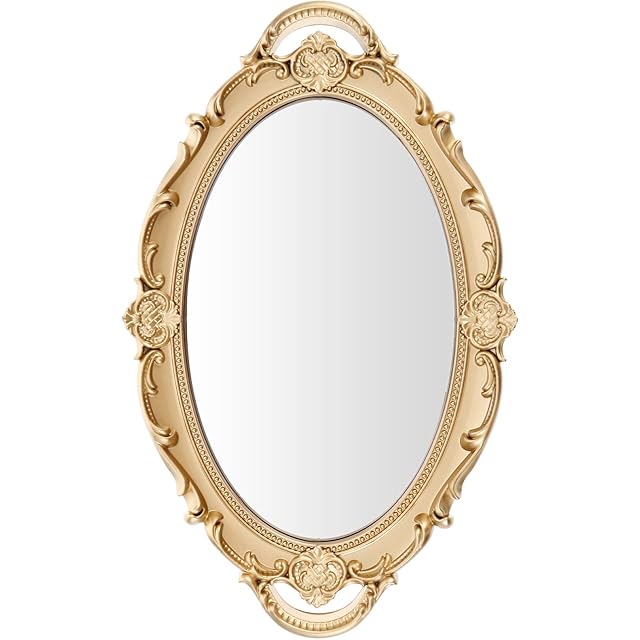 OUNONA 鏡 ミラー 化粧鏡 壁掛け 鏡 ゴールド 楕円形 レトロ おしゃれ 小型 フレーム 38x23cm フランスの 宮殿エンボス加工 トレイ インテリア 部屋の装飾
