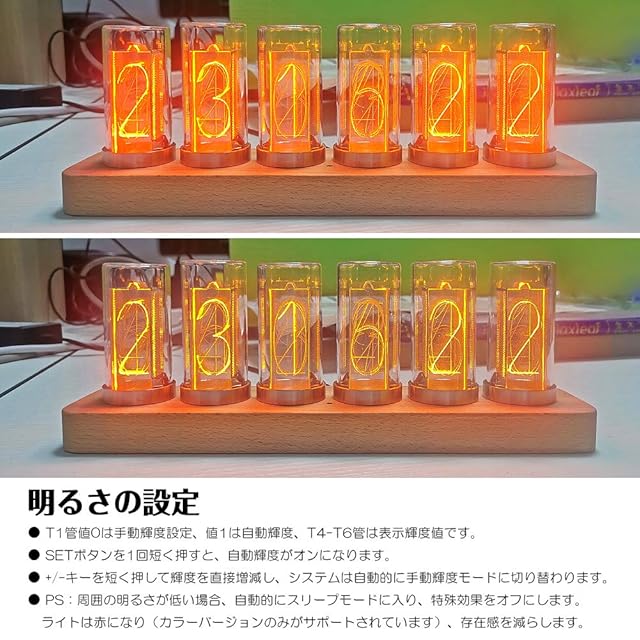 組み立て手順:<br> 1.デジタル管本体を取り付けます。<br> 2.アクリルカバーを取り付けます。<br> 3.ネジを締めます;<br><br> ご注意ください:<br> アクリルカバーは壊れやすく、ネジがカバーに軽く接触するだけで良いです、しっかり締めしないでください。<br><br> 明るさの設定:<br> 1:EFFキーを押すと、チューブに輝度値(0-100)が表示されます。+または-キーを押し続けると、輝度が増減します。<br> 2:EFFキーを2回押して、明るさの設定を完了します。<br> 3:EFFキーを3回押して、グローバル輝度をスキャンし、自動輝度適応状態に入ります。<br><br> 時計/アラーム設定:<br> SETキーを押すと、時刻設定状態に入り、時刻ビットが点滅し、残りは通常どおり表示されます。+または-キーを押して設定します。<br> SETキーを2回押すと、時計の分値設定状態になり、時計の分ビットが点滅し、残りが正常に表示されます。+または-キーを押して設定します。<br> SETキーを3回押して、目覚まし時計の時間値設定状態に入り、アラーム時間ビットが点滅し、残りのチューブが消えます。+または-ボタンを押して設定します。<br> SETキーを4回押して、目覚まし時計の分値設定状態に入り、目覚まし時計の分ビットが点滅し、残りのチューブが消えます。+または-キーを押して設定します。<br> SETキーを5回押して、時計/アラーム設定を完了します。<br> PS:アラームは00:00に設定すれば、アラームをオフにします。<br><br> 説明:<br> 1.ボタン電池で給電可能、再起動しても、時間の再設定必要はございません。<br> 2.質および色の違いがあります;<br> 3.チューブ本体と内部が非常に透明な材料であることを示しており、製造および組み立て中に微量の不純物を導入した恐れもあります。<br> 4.屋内での使用、環境に直射日光または相当量の光度がある場合、製品の効果に影響します。<br> 5.チューブ高さのわずかな違いがあります。 <br>