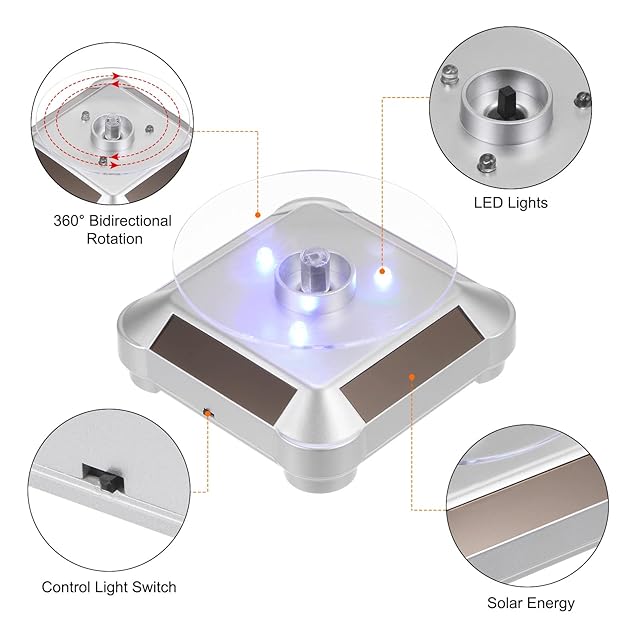 <br /><br /><br />回転式展示棚は良質のABSプラスチックでできており、回転盤にひび割れがなく、回転時の騒音が低く、耐久性があり、破損しにくいです。LEDライトは追加の照明効果を提供して、製品をより人目を引くものにします。ライトはスイッチによって制御できます。<br /><br />ソーラー回転ショーケースは2電源で、ソーラーまたは単3電池で回転させることができます。360度の回転に対応し、バランスが安定しており、光の強さに応じてターンテーブルの速度が変化し、手動で回転方向を反転させることができます。<br /><br />ソーラー回転スタンドは、家庭、店舗、展示会、オフィスなどに最適です。時計や宝飾品、携帯電話などさまざまなアイテムを展示し、顧客の支持を得ることができます。また、3Dプリントの表示にも最適です。<br /><br />ジュエリー展示用ターンテーブルは、簡単に組み立てられて使用できます。バッテリーを取り出し、暗い場所に置くと、ダイヤルが自動的に回転を止めます。<br /><br />