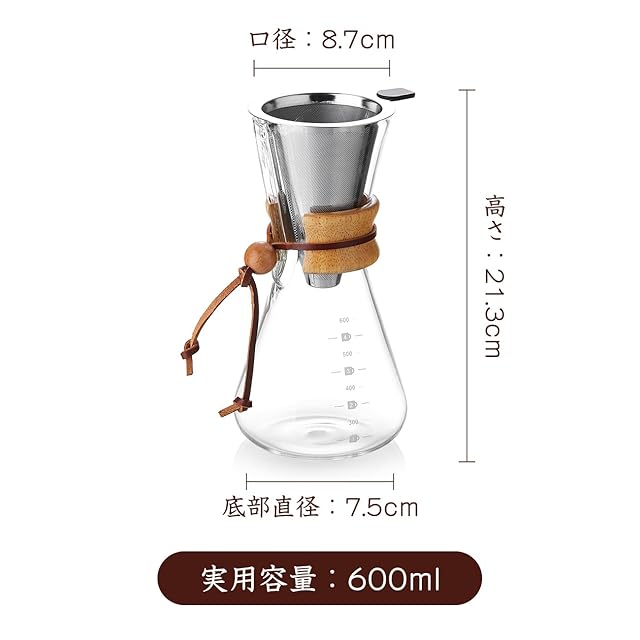 <p>【優れた素材と品質】:本製品は耐熱ホウケイ酸ガラスを使用しており、透明度が高く、急激な温度変化にも強い耐久性を持っています。耐熱温度差は170度に対応し、温かいコーヒーから冷たい飲み物まで安心してご利用いただけます。フィルターには18-8ステンレス鋼を採用し、繰り返し洗浄して使用でき、環境に優しい構造です。紙フィルターが不要なため、コーヒーの本来の香りを存分に楽しめます。</p> <p>【洗練されたデザイン】:シンプルでエレガントなデザインが特徴のガラス製コーヒードリップサーバーです。目盛り付きで、抽出量を簡単に調整可能。注ぎ口は外突デザインを採用し、水流をコントロールしやすく、液体が飛び散りにくい構造です。また、中央部に設けられた木製ハンドルは握りやすく、火傷を防ぎつつ、安定感のある持ちやすさを提供します。</p> <p>【紙フィルター不要で経済的】:二重構造のステンレスフィルターを採用しており、濾過孔が非常に細かく、コーヒーの旨み成分をそのまま抽出。紙フィルター特有の匂いがなく、手軽においしいコーヒーを楽しめます。使用後も水ですすぐだけで簡単に清潔に保てます。</p> <p>【実用的なサイズと容量】:高さ21.3CM、口径(注ぎ口含む)8.7CM、ベース直径7.5CM、満水容量888ml、実用容量600mlとなっており、ご家庭はもちろん、オフィスやアウトドアにも適しています。さまざまなシーンでご使用いただけるサイズです。</p> <p>【ギフトにも最適】:透明で美しいデザインは、コーヒー愛好家だけでなく、ご家族やご友人へのプレゼントにも喜ばれます。ハンドドリップの楽しさを味わえるこのコーヒーサーバーで、素敵なコーヒータイムを贈り物にどうぞ。</p>