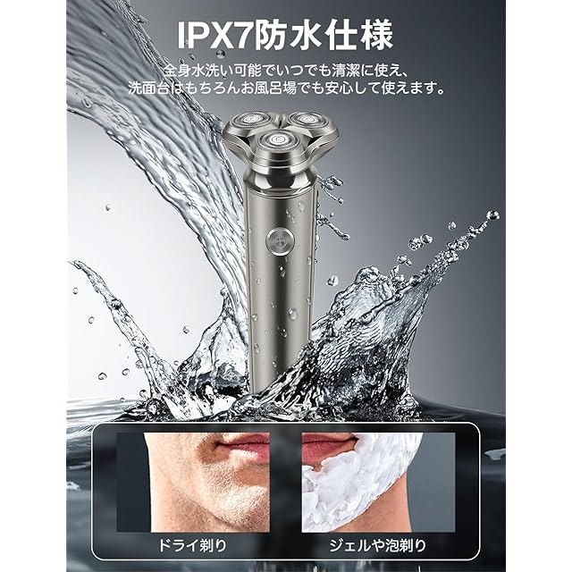 【ウェット&ドライ両用・IPX7防水】IPX7防水設計なので、電気シェーバー はドライシェービングだけではなくお風呂剃りもでき、泡やジェルをつけていっそう肌に優しいシェーピングを実現できます。ヘッドロッグボタンを押して、ヘッドを開きながら水洗いするだけでお手入れ簡単で、いつでも清潔を保てます。
