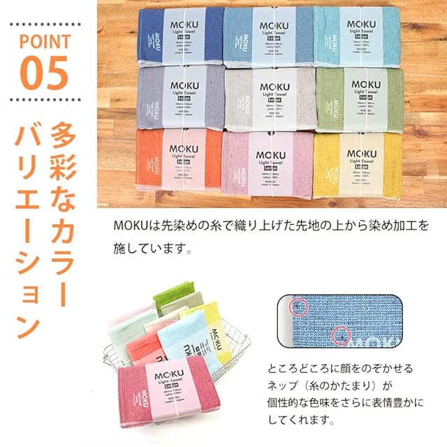 先染めの糸を使用して織り上げ、生地の上から染め加工を施しています。ところどころに顔を覗かせるネップが個性的な色味をさらに表情豊かにしてくれます。少し長めで薄く、吸水、速乾性に優れ、使い心地がとてもいい。大変な手間と時間を必要とした「着色抜染技法」と言われる染色方法を用いるなど、MOKUは伝統の技にもこだわり抜き、使いやすさとかっこ良さを追求したタオルです。<br><br>サイズ:60×120cm<br>素材:COTTON 100%<br>生産地:日本/愛媛