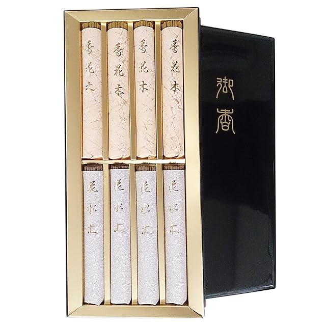 お線香ギフト お線香贈答用 高級お線香。<br>天然沈香と天然白檀のご進物用線香。喪中はがきが届いた際の喪中見舞い、お見舞い、初盆・新盆・お盆・一周忌・三回忌・七回忌・命日などの法事法要のお供え物に沈香花水木 白檀香花木 (塗箱) 淡路梅薫堂謹製。<br> <br>沈香・白檀の貴重な香木は昔から儀式で使われ丁寧な慎重な空間が頂けその気持ちが生まれます。その香木の粉末を線状にした最高級のお線香・お香はその場を失礼しないよう心をそめる。天然沈香は不安定から冷静で静かなおちつく気持ちが頂けます。天然白檀は目の前に反応する短気から穏やかな気長な気持ちがいただけます。最高級のベトナム産シャム沈香と最高級インドマイソール州産の老山白檀使用の安心のお線香でございますのでギフトにお勧めでございます。大人しい8束の一つにまとまったお線香が塗箱に入っており、そのお選びのお気持ち想いが伝わります。<br> <br>創業から百年以上の歴史を誇る淡路梅薫堂製造。長年の伝統製法を大切にお線香を作り続けております。全国の生産量七割りを占める日本一のお線香生産地は淡路島西海岸にあります。中でも全国唯一といえる線香屋が軒を連ねるかおり風景100選の一つ江井。良いお線香を作るのに相応しい、偏西風を利用する西側を向いた県道31号線のお線香に好まれる一番といえる良い場所で丁寧に製造してお届けします。<br>ご進物用・ギフト・贈答用お線香は、大切な方へ想いを形に淡路梅薫堂のこだわりお線香の香りに託してどうぞ。