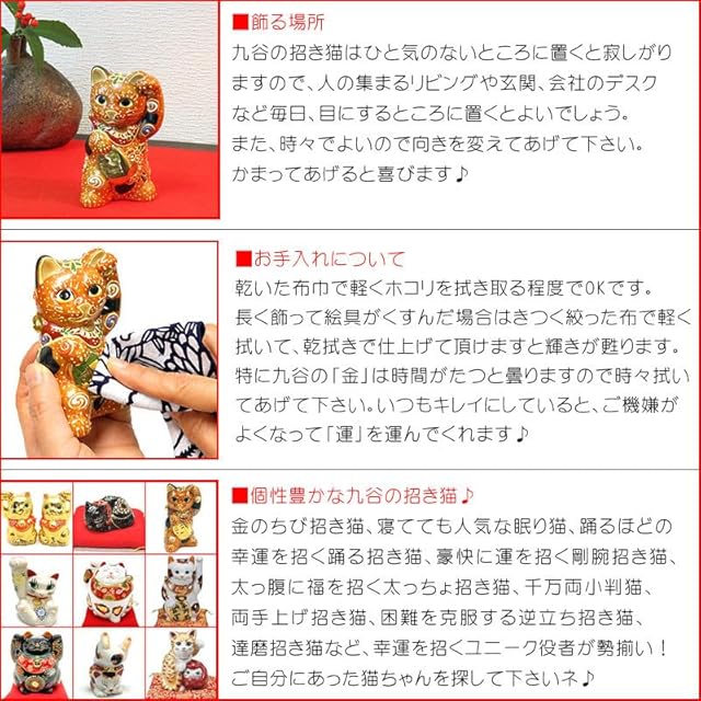 ■商品詳細<BR> 加賀百万石に代表されるその豪放、華麗な風格を持つ作風は他の焼き物の追従を許さないものがあります。開窯以来360年の歳月を経た現在も尚、その技は脈々と受継がれ世界的に高く評価されております。<BR><BR> ■招き猫のご利益<BR> 右手招き猫「金運招福」、左手招き猫「千客万来」、白-開運招福、黒-厄難消除、赤-無病息災、金(黄)-金運満足、ピンク-恋愛成就、青-仕事運・学力向上<BR><BR> ■経済産業大臣指定伝統工芸品【九谷焼】<BR> ■生産国:日本製<BR> ■素材:陶磁器(九谷焼)<BR> ■ギフトBOX仕様:専用 紙箱入り<BR> ■贈答用:新築祝い 開店祝い 竣工祝い 本社移転祝い 母の日 父の日 敬老の日 退職祝い 還暦祝い 古希祝い 喜寿祝い 傘寿祝い 米寿祝い 誕生日プレゼント ギフト などにおすすめ!<BR> 九谷焼は日本の三大色絵磁器として、また日本を代表する伝統工芸『Japan Kutani』として世界的にも高く評価されております。