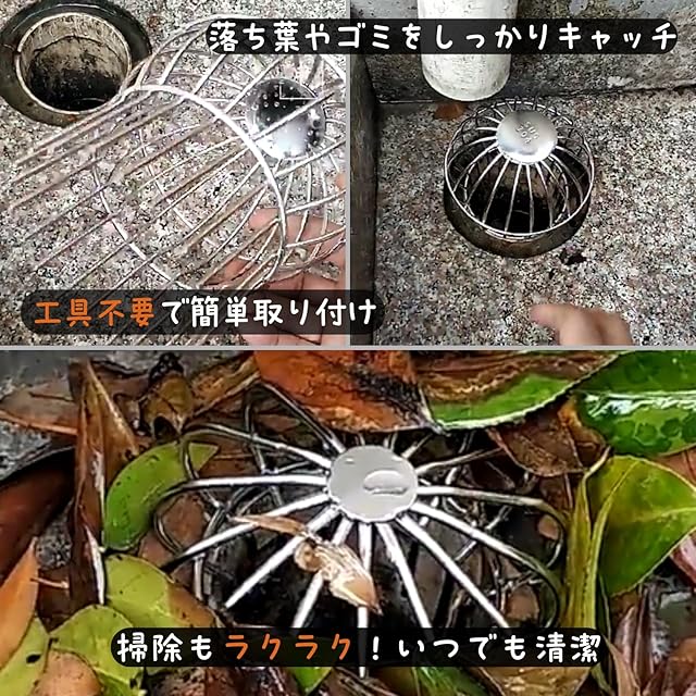 \排水トラブルを防ぐ!ステンレス製の落ち葉ストレーナー/<br/>ベランダや雨どい、側溝の排水溝に差し込むだけで、落ち葉・ゴミによる詰まりを強力ガード。<br/>高通水構造で水はけ良好。工具不要・簡単取付、風雨でもズレにくい設計。<br/>耐久性に優れた304ステンレスを採用し、長期間メンテナンスフリー。<br/>防臭・虫の発生も予防し、屋外環境を快適に保ちます。<br/><br/>●製品特長<br/>・枯れ葉やゴミをしっかりガードし、排水溝の「詰まり」を防止<br/>・ステンレス製で「錆びにくく」「耐久性抜群」長く使えて経済的<br/>・差し込むだけの簡単設置、工具や加工は一切不要<br/>・雨どい・ベランダ・側溝など多用途に対応<br/>・防臭・虫の発生・ぬめりなど二次トラブルも軽減<br/>