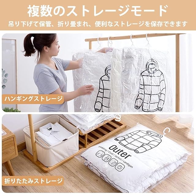 【収納セット5枚】ダウンジャケットやロングコートなどの衣類にかかわらず、幅広い種類の服、ズボン、ショーツを扱うことができるコンパクトな吊り下げ用圧縮セットです。サイズ:約67*90CM*3枚+約67*110CM*2枚+ポンプ